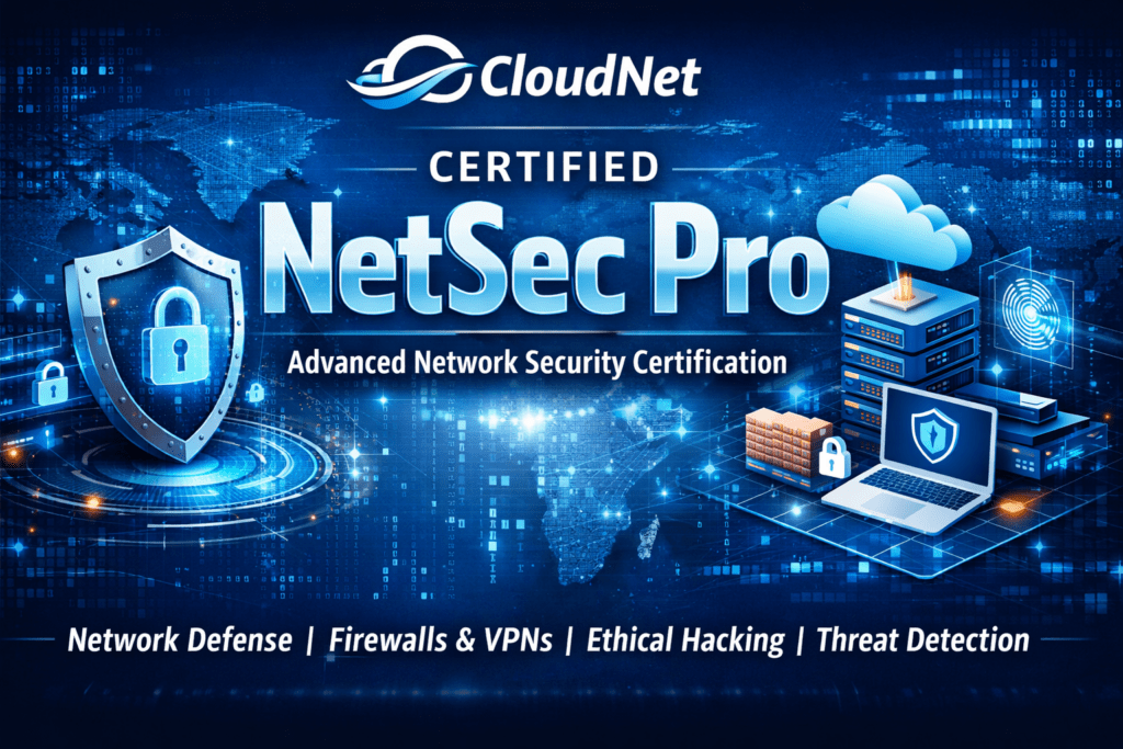 The CloudNet Certified NetSec Pro is a long-term, industry-aligned professional diploma program designed to build strong expertise in Enterprise Networking, Cybersecurity, SOC Operations, Cloud & Hybrid Infrastructure, and Ethical Hacking.