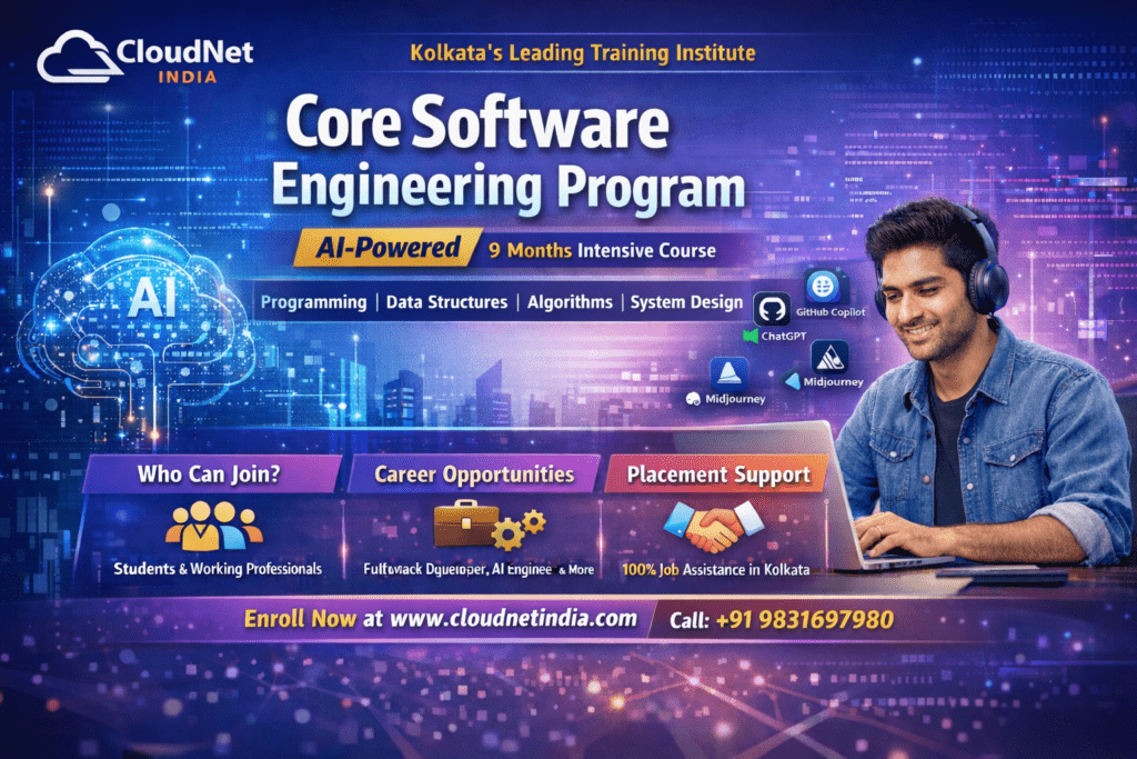 The 9-Month Core Software Engineering Program (AI-Powered – 2026 Ready) by CloudNet India, Kolkata is a strong foundation-focused program designed to build real software engineers, not just framework users.